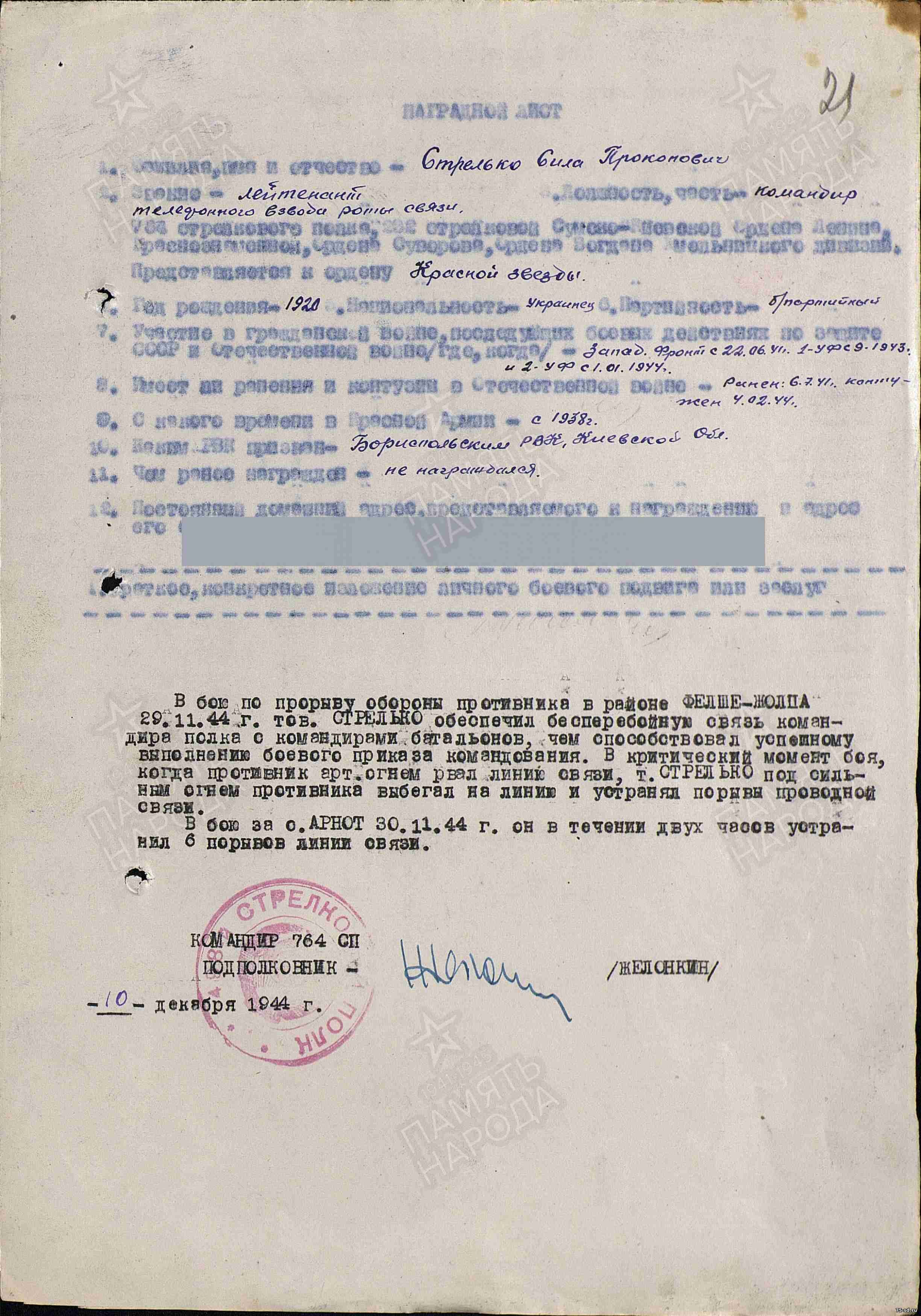 СТРЕЛЬКО Сила Прокофьевич, лейтенант. Командир взвода светосигнальной радиосвязи роты связи 115-го стрелкового полка.
