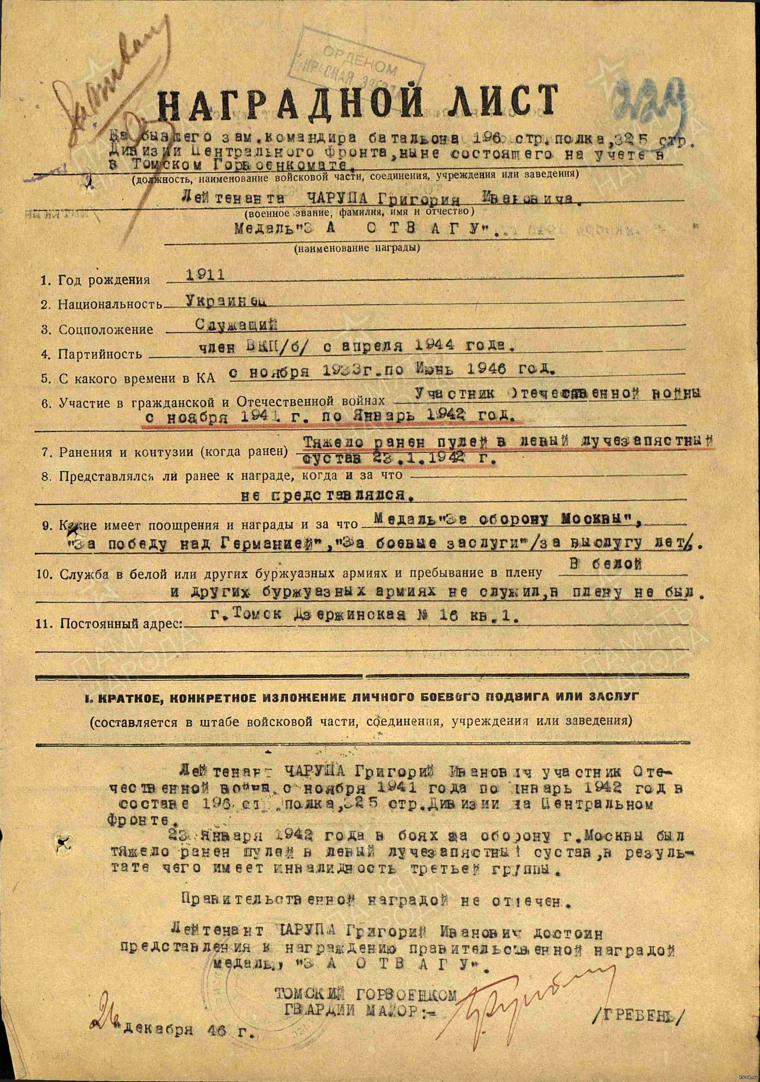 Проживал в г.Томске.Документы архивов: Список потерь Западного фронта Приказ ГУК НКО СССР об исключении из списков Документ Томского ВПП Награждение медалью "За отвагу"