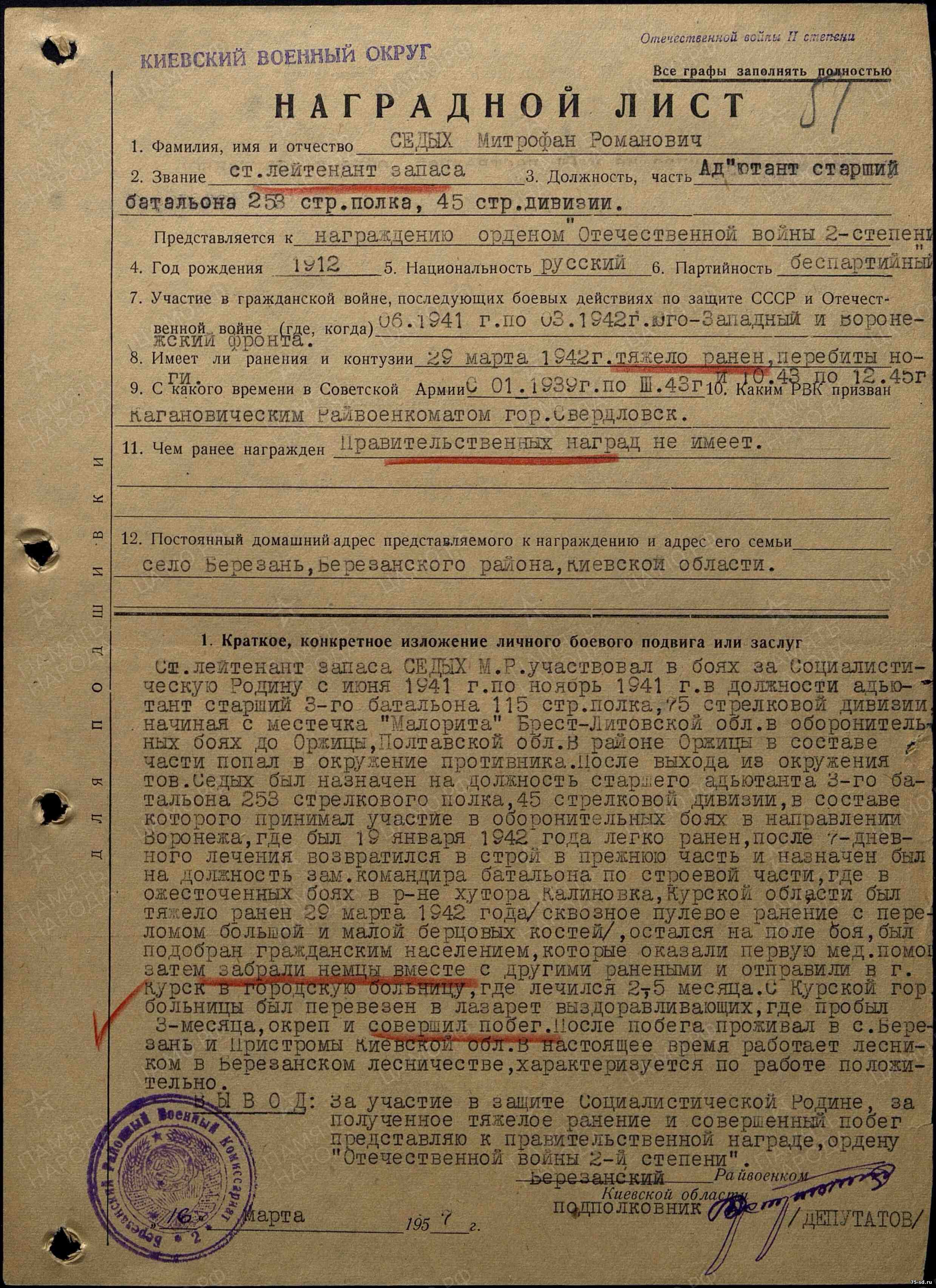 По данным Березанского РВК Киевской области младший лейтенант М.Р.Седых был уволен в запас и проживал в Киевской области.