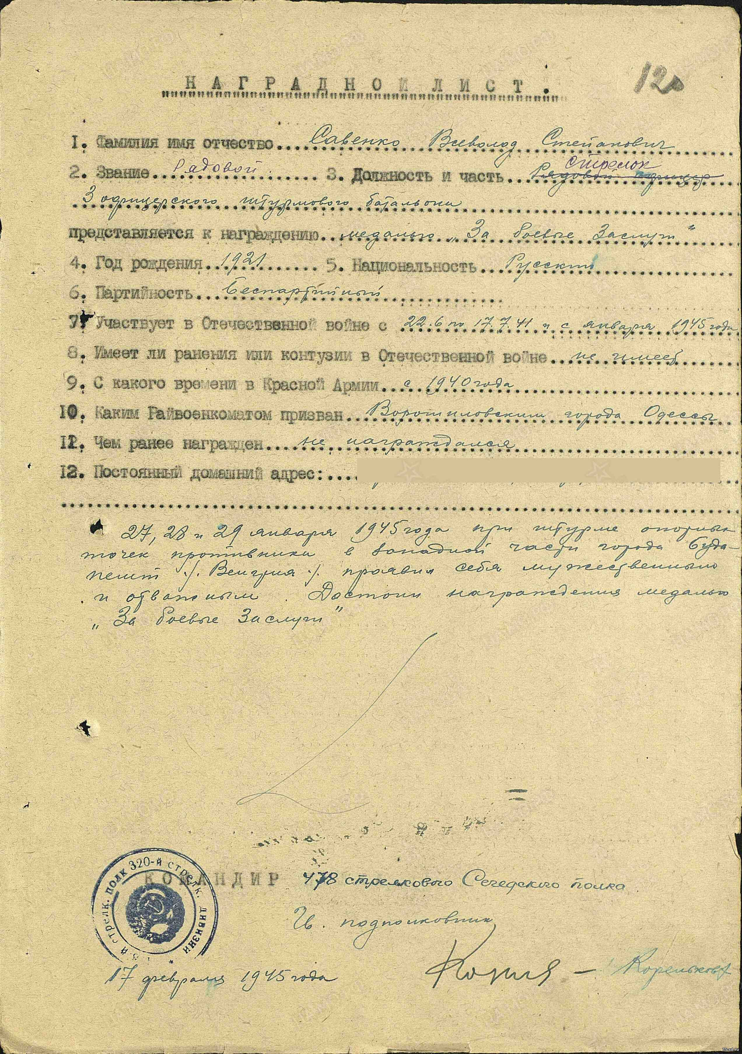 Освобожден в декабре-январе 1945 года. После прохождения спецпроверки направлен рядовым в 3-й офицерский штурмовой батальон 320-й стрелковой дивизии 3-го Украинского фронта. В феврале 1945 года награжден медалью "За боевые заслуги".