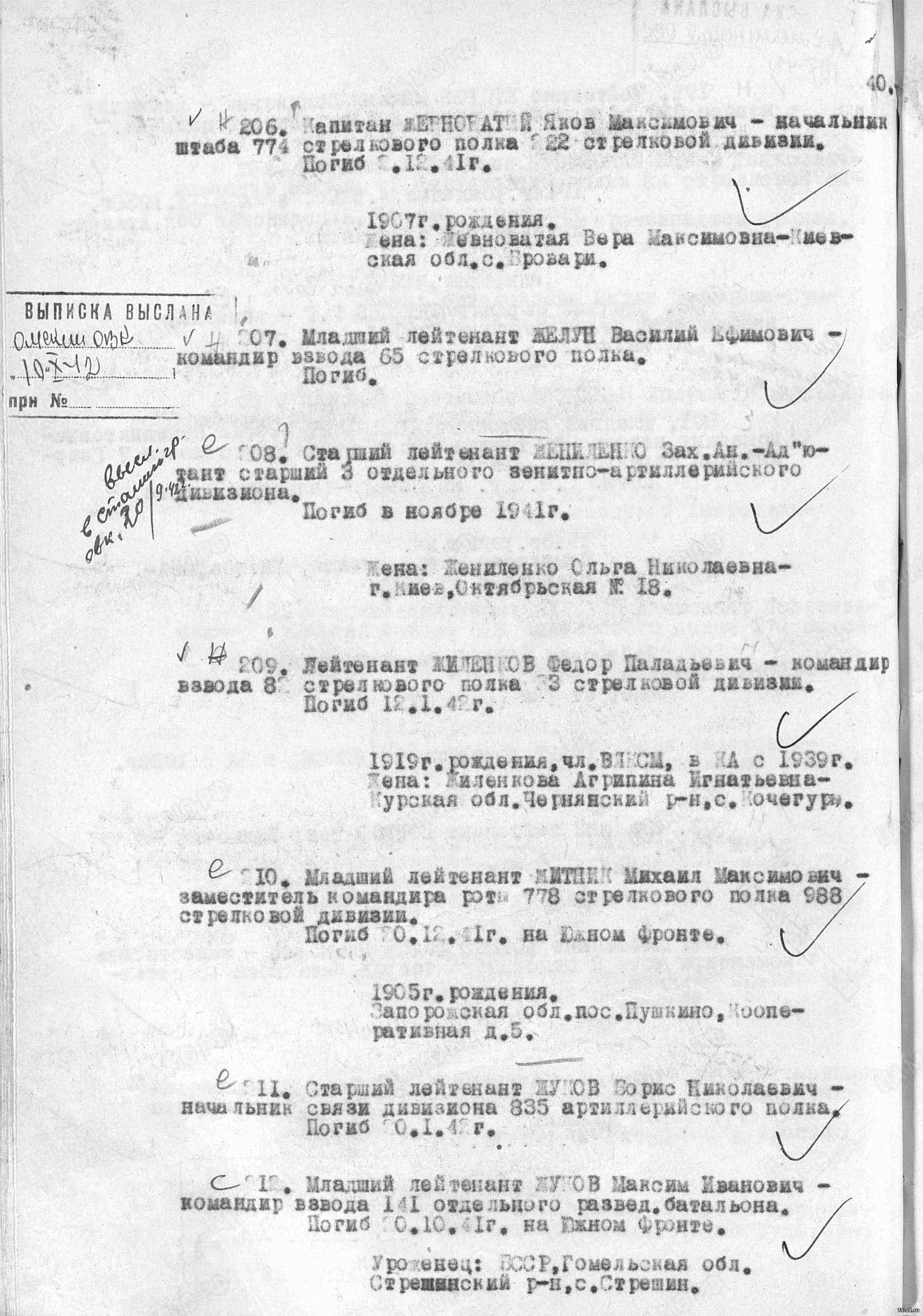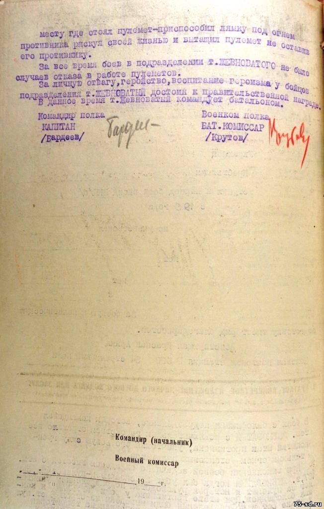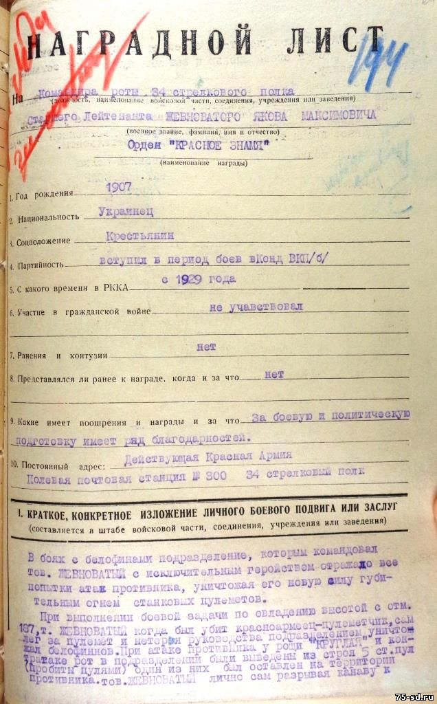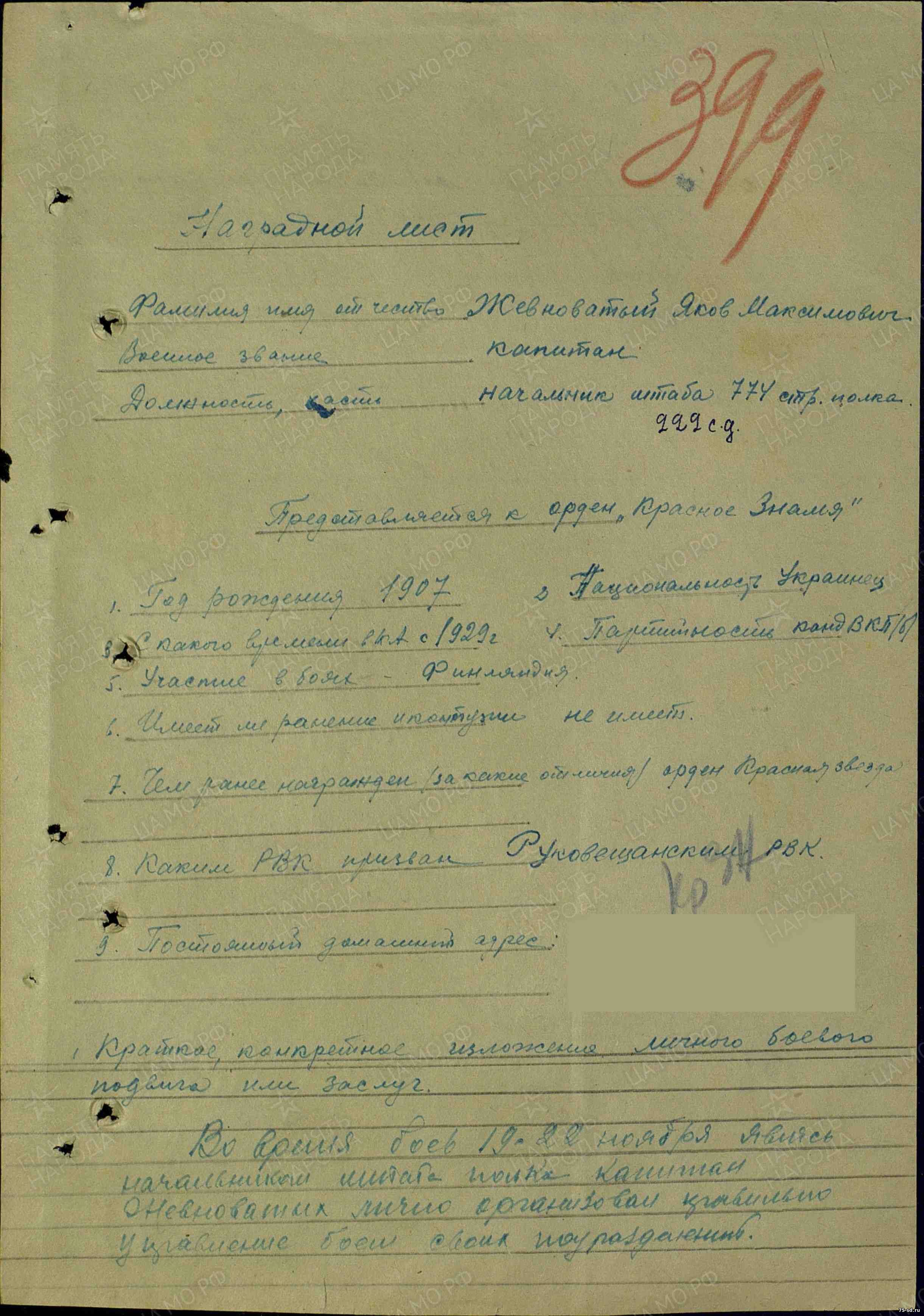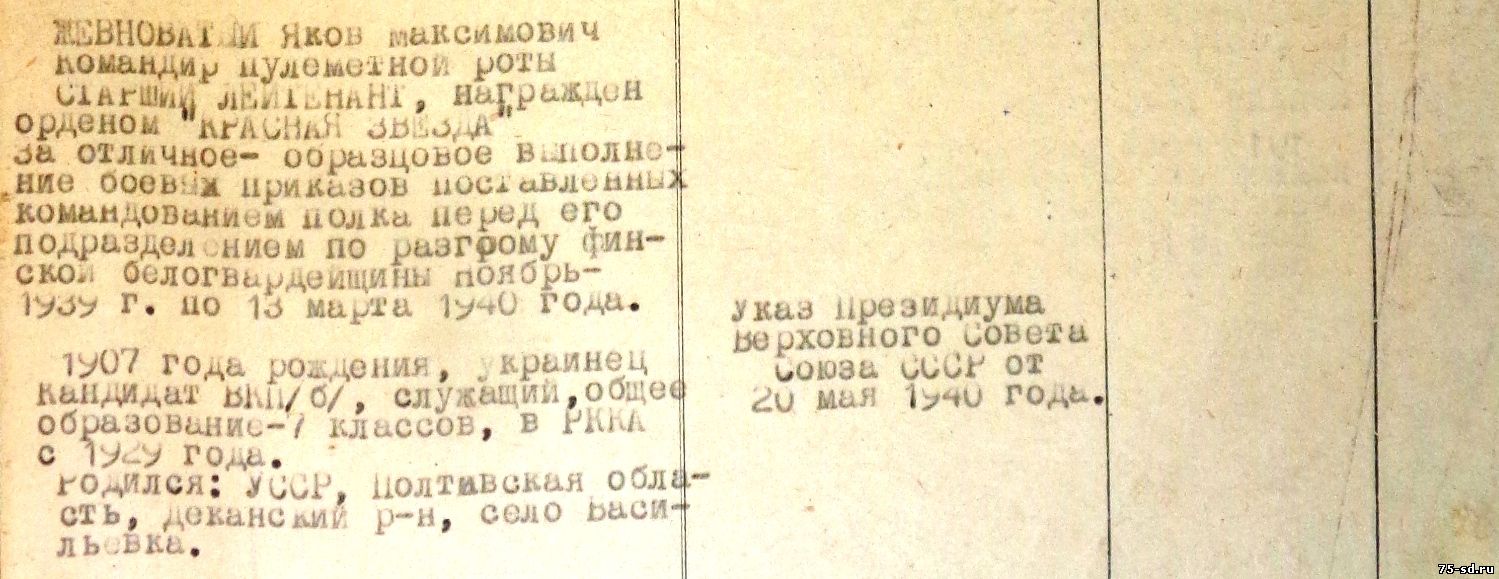 Наградной лист на старшего лейтенанта Якова Максимовича Жевноватого