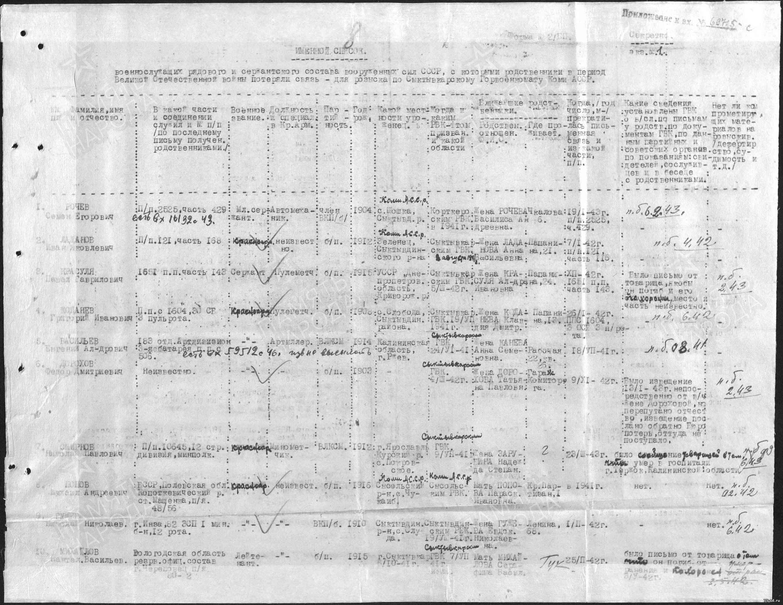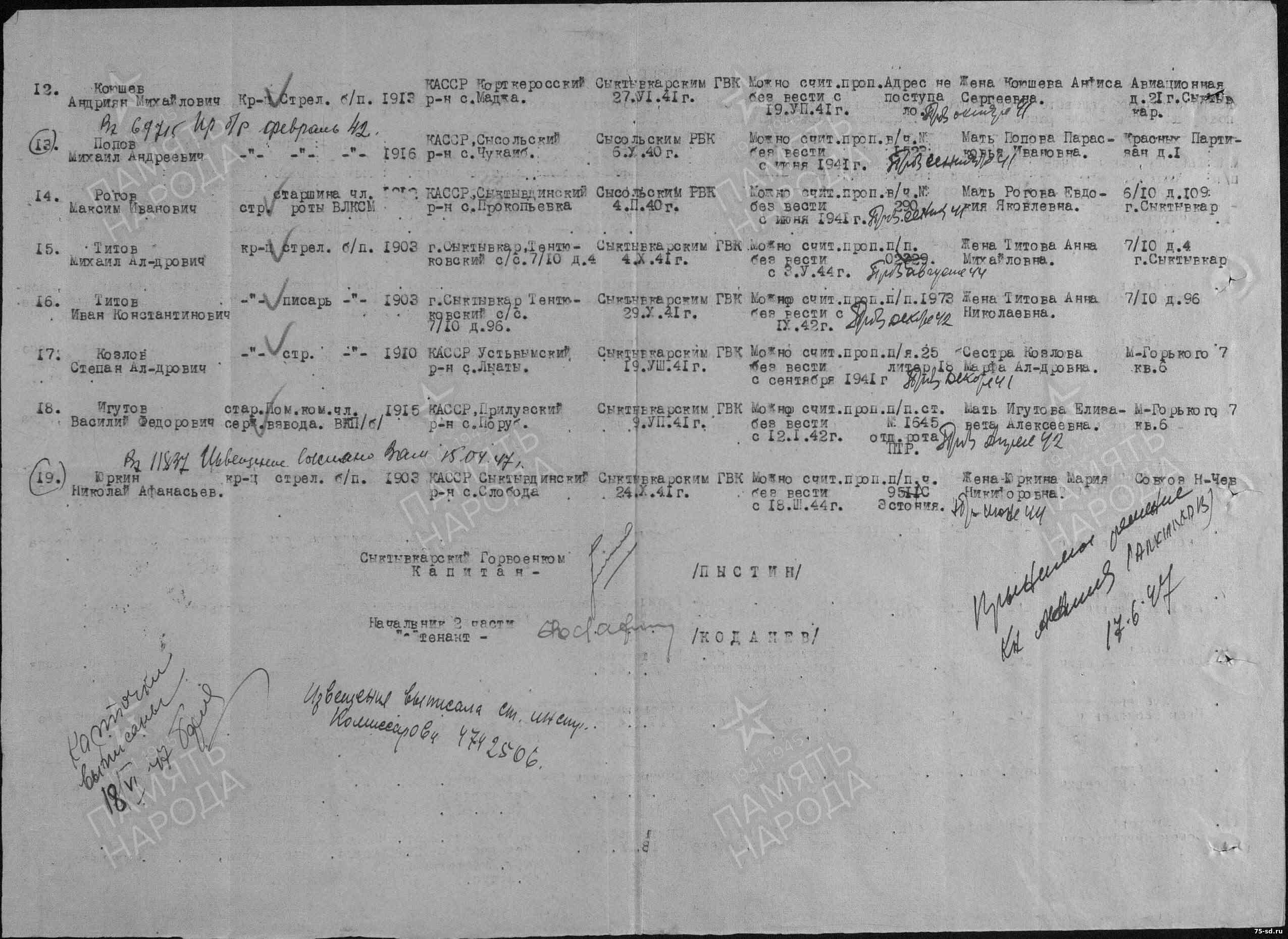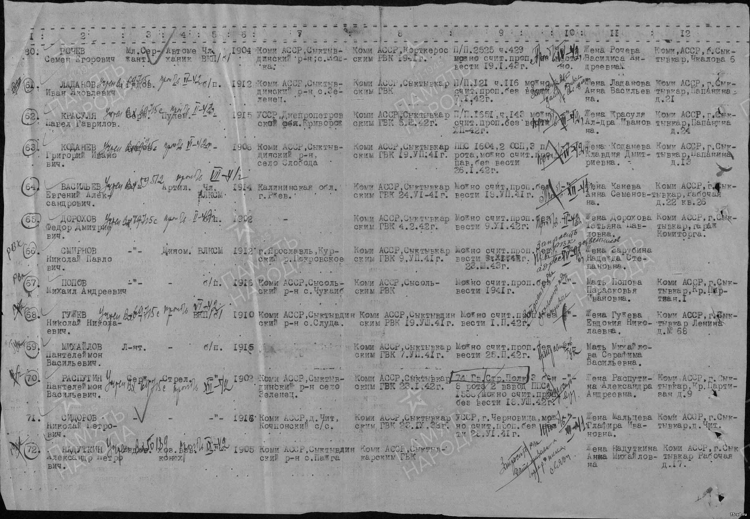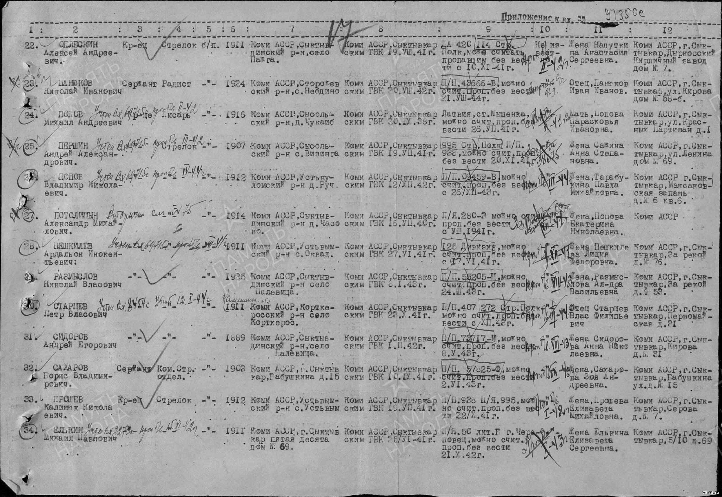 Пропал без вести в июне 1941 года. Последнее письмо датировано июнем 1941 года, п\я 48\56.