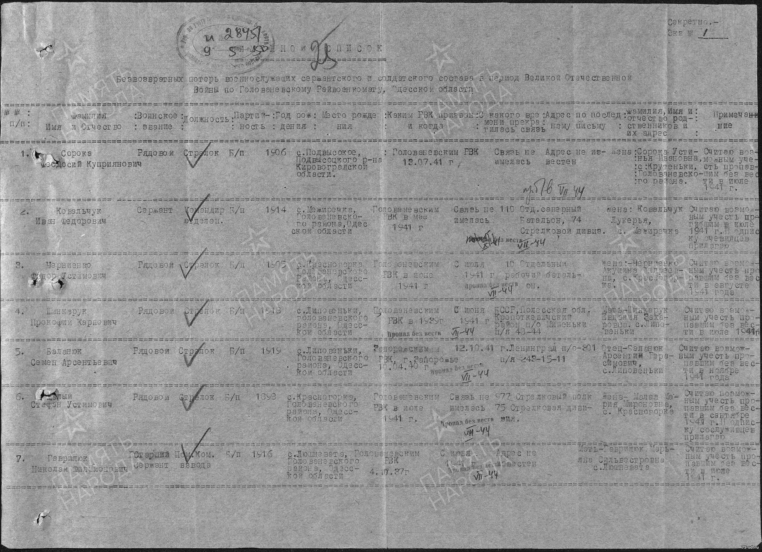 Пропал без вести в июне 1941 года. Последнее письмо датировано июнем 1941 года, п\я 48\44.