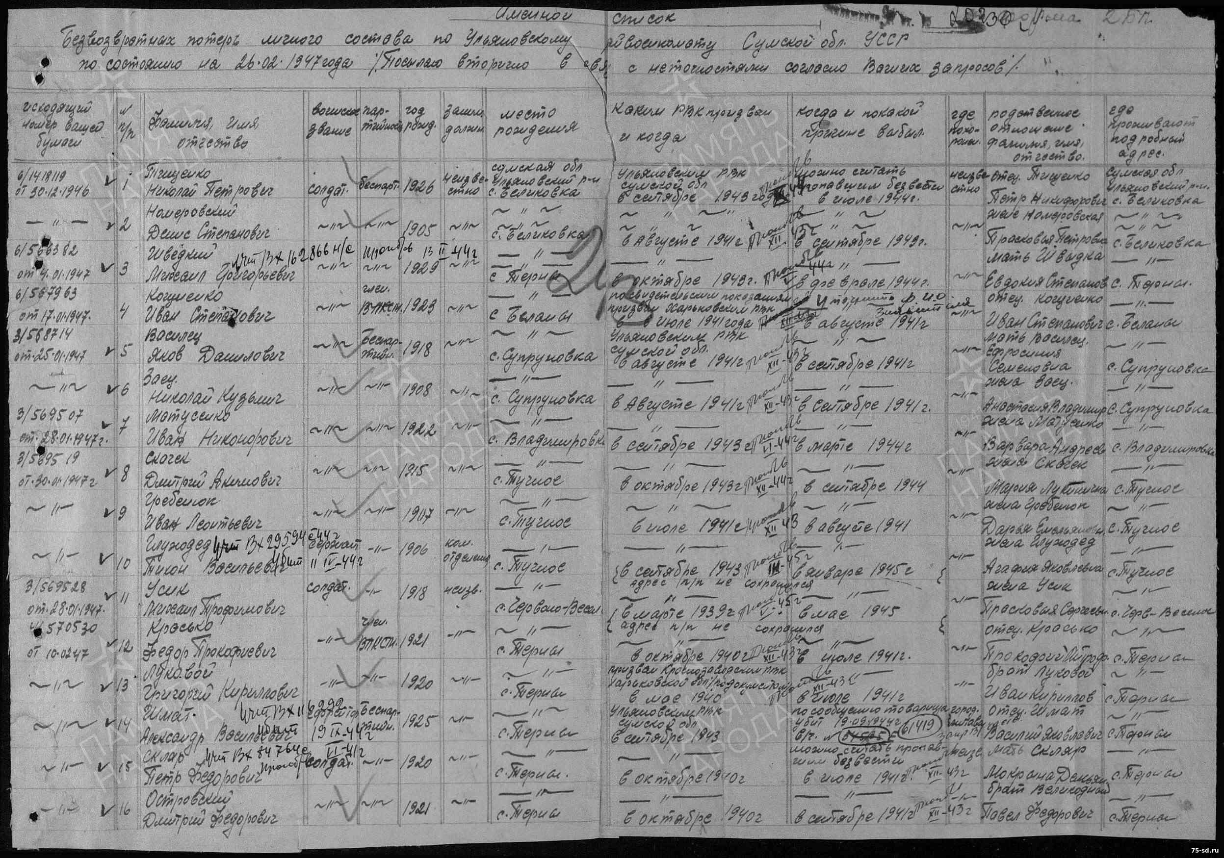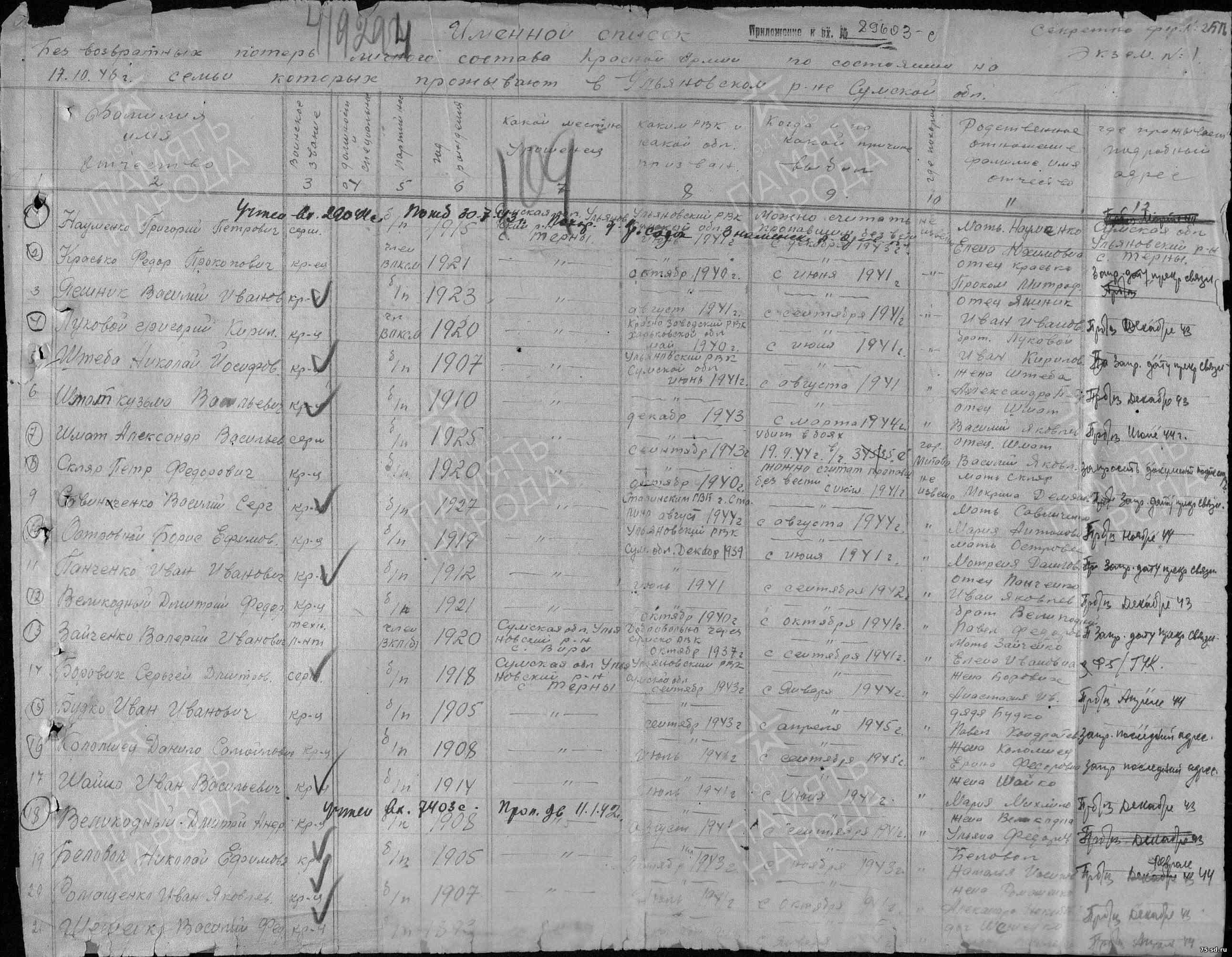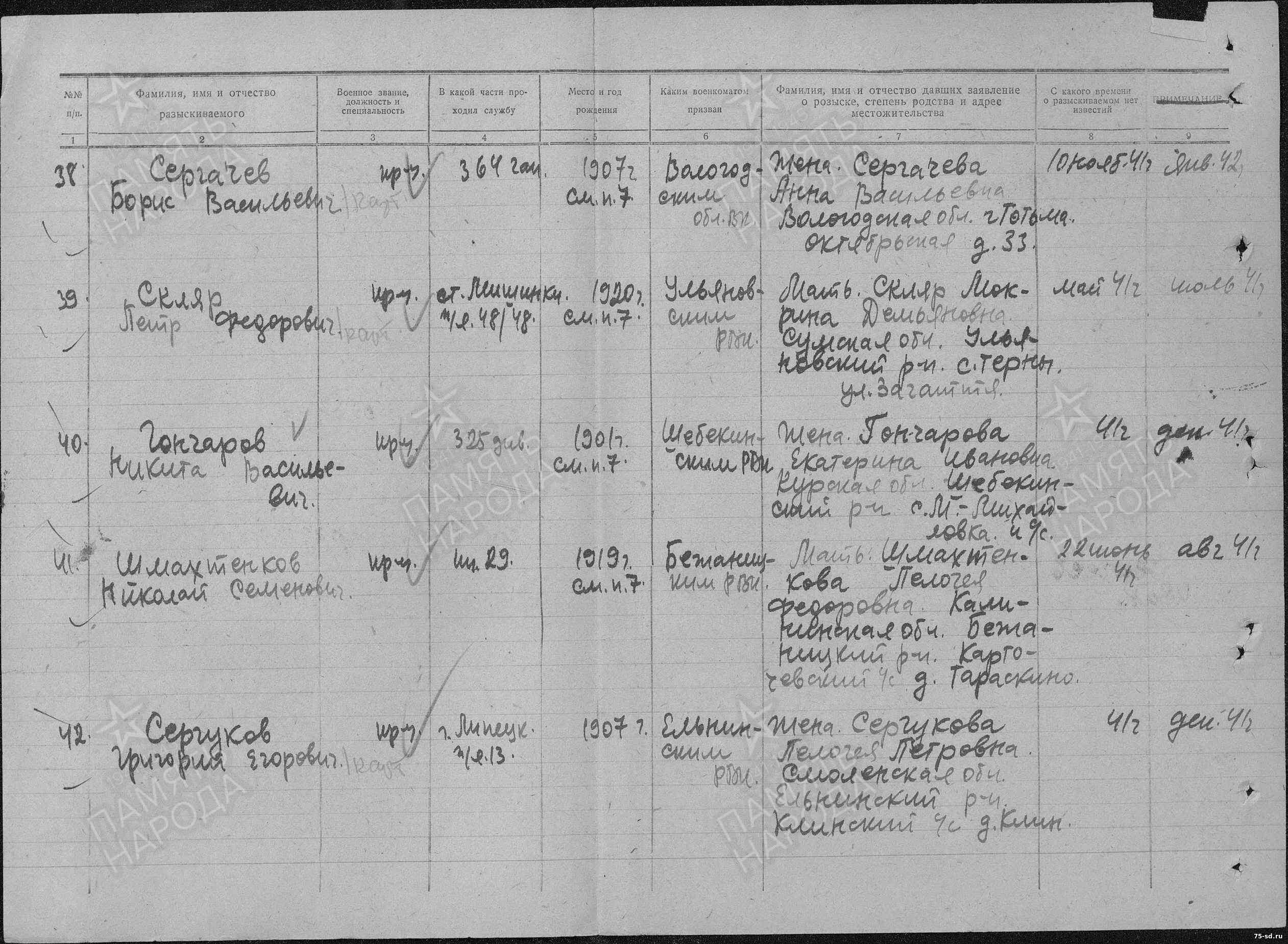 Пропал без вести в июне 1941 года. Последнее письмо датировано маем 1941 года, п\я 48\48.