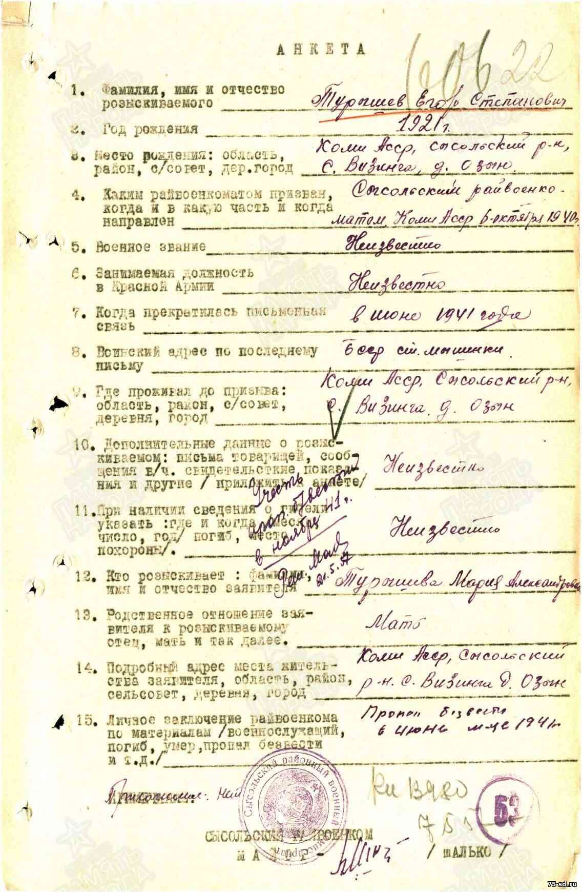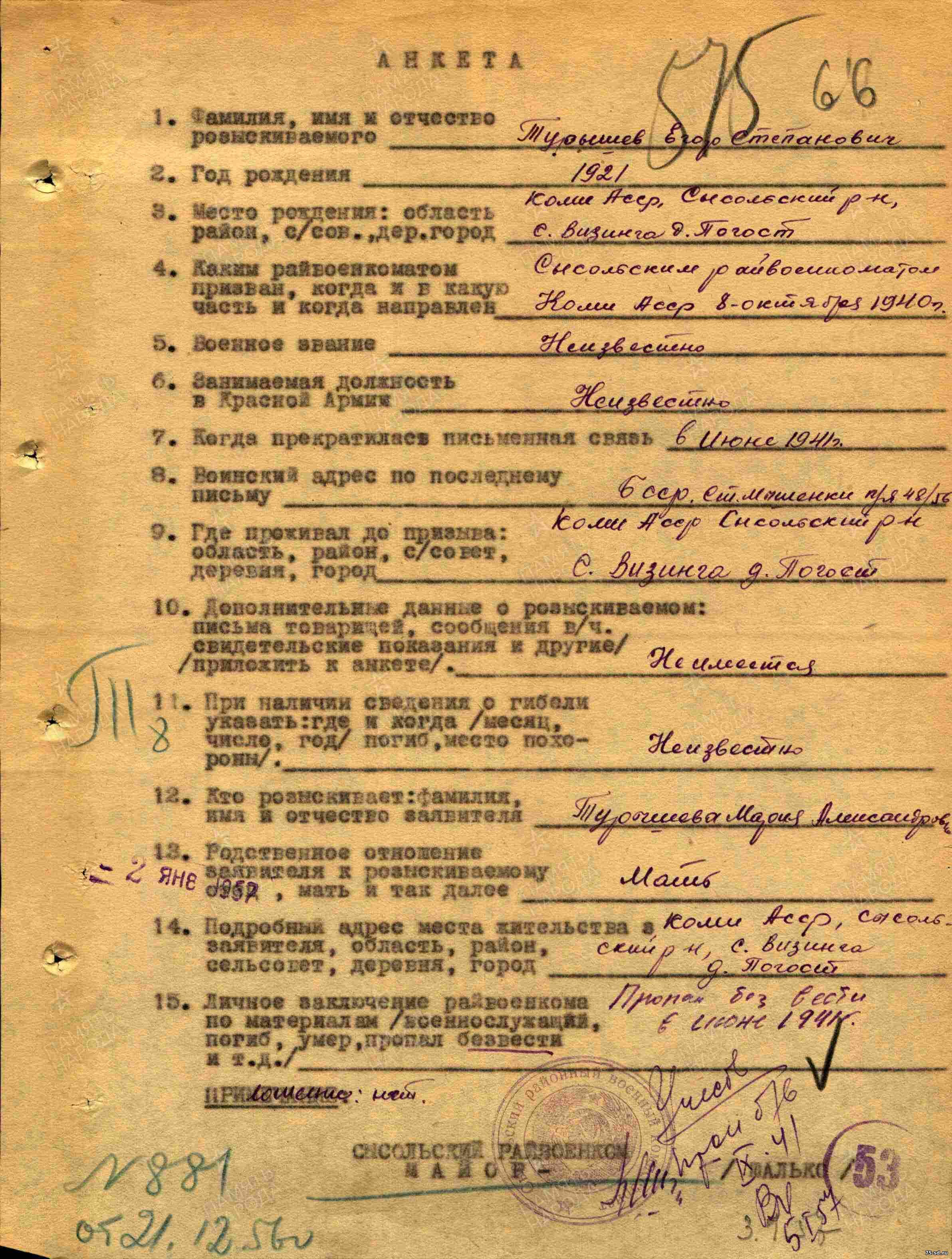 Пропал без вести в июне 1941 года. Последнее письмо датировано июнем 1941 года, п\я 48\56.