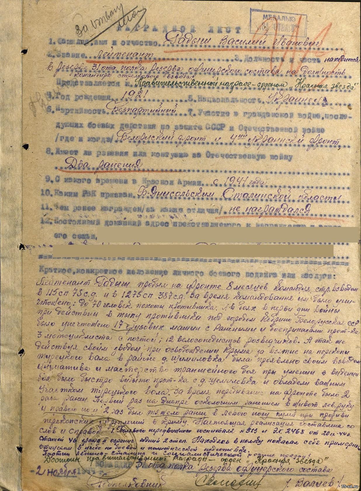 Администрация сайта "Памяти воинов 75-й стрелковой дивизии" выражает сердечную благодарность дочери Василия Ивановича Радыш – Бауэр Ирине Васильевне за предоставление дополнительного материала биографического характера для составления данной статьи.