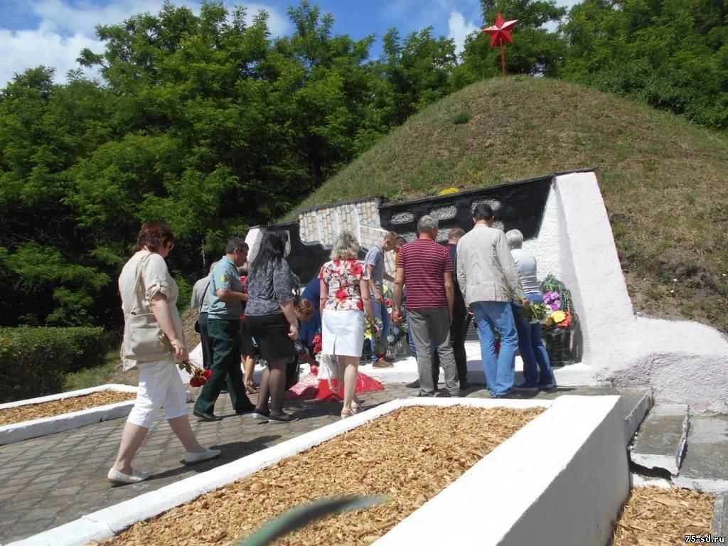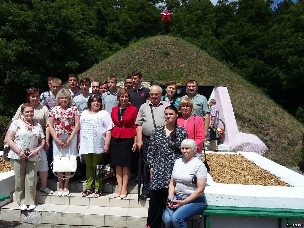 Курган Славы воинам 75-й стрелковой дивизии у Меловой горы, здесь в первые дни войны погиб командир взвода 115-го стрелкового полка младший лейтенант Игнат Романович Цукалов, прикрывая вместе со своими бойцами отход полка на новые позиции. Его сын и внук уже не первый год приезжают на братскую могилу, чтобы почтить память Игната Романовича. Вместе со студентами лесотехнического техникума гости возложили венки и почтили память минутой молчания.